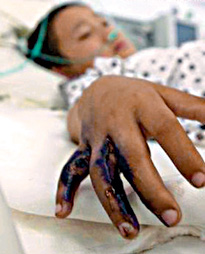 suffered serious wounds on his fingers and right leg with chemical blisters.