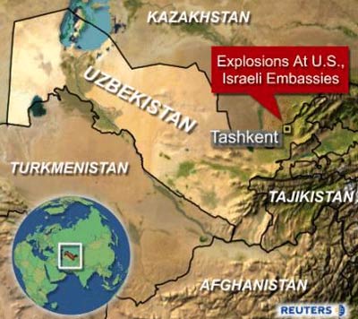 Explosions struck the U.S. and Israeli embassies and the prosecutor's office in the Uzbek capital Tashkent on July 30, 2004, causing a number of casualties. [Reuters]