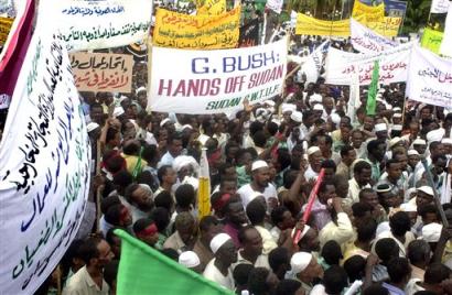 Protesters in Khartoum, many from organized pro-government groups but including many ordinary citizens, carried anti-American banners and chanted slogans attacking U.N. Secretary-General Kofi Annan for his close alignment with U.S. policy.