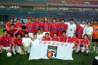 The Chinese Star Soccer Team poses for a group photo at Qin Huangdao Olympics Stadium, Hebei Province August 8, 2004. The team with an all-star line-up from Chinese entertainment field came to be a 2-2 draw with the Charity Enterprise Soccer Team, in a bid to fund a children's TV show by China Children And Teenagers' Fund. [newsphoto]