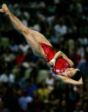 Guo Jingjing of China dives on her way to winning the gold medal in the 3 metre women's springboard final at the Athens 2004 Olympic Games August 26, 2004. [Reuters]