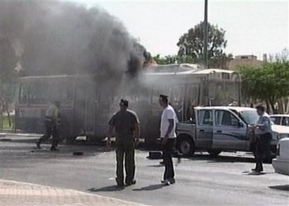 The buses burst into flames in the center of Beersheba, the largest city in southern Israel, 25 miles west of Gaza City. Israel TV showed the two burned-out buses, flames shooting through the roof of one of them. At least two bodies, covered in white sheets, lay on the ground.