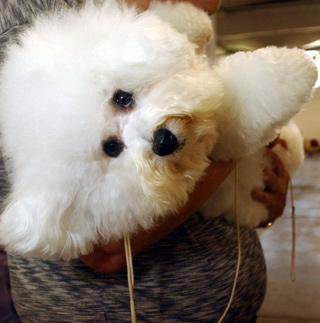 bichon Frises, relaxes after working hard to win 'best of breed' at the