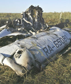 Parts of a Russian Tu-134 airliner, which crashed near the village of Buchalki in the Tula region, about 200 kilometres south of Moscow, are seen Wednesday. [AP]