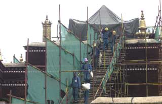 Workers repair the roofs of the Potala Palace in Lhasa, Tibet Autonomous Region in this July 20, 2004 file photo. [newsphoto]