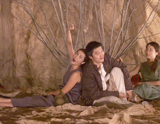 The enlarged stage has been transformed into a cherry orchard, with eight forlorn trees dotting the yellow earth. And a foreboding sky of limestone bears down upon the audience. Here resembles a grotto, and one can only marvel at the stage designers, Yi Liming and Tan Shaoyuan, who have worked wonders to craft this life-like landscape from plastic and iron wires.
