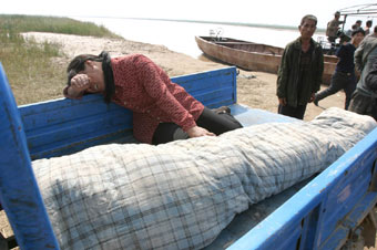 A relative of a victim cries by their family member's body Thursday after a river ferry capsized Thursday in Linyi County, North China's Shanxi Province, when carrying 65 local villagers to flooded land to pick cotton. Twelve villagers were confirmed dead, 17 survived and the rest are still missing. [newsphoto]