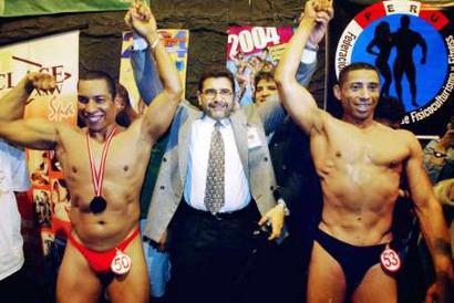 President of Peru's Body Building Federation, Florencio Portocarrero (C),