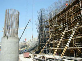 Construction workers gather at left, after a wall collapsed at the Dubai Airport's new terminal construction site killing more than eight workers and injuring many others, Monday Sept. 27, 2004. The state-run United Arab Emirates news agency said the building site was part of a $4.1 billion expansion project for Dubai airport, one of the busiest in the Middle East. [AP]