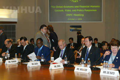 Zhou Xiaochuan (2nd R Front), governor of the People's Bank of China, attends a meeting of the International Monetary and Financial Committee (IMFC) in Washington, the United States, Oct. 2, 2004. [Xinhua]