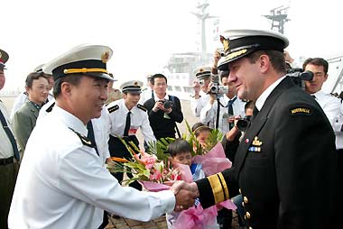 A Chinese genearl welcomes Rowan Moffitt, chief of staff of Australian maritime headquarters. [newsphoto]