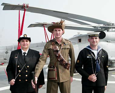 Sailors on the Australian frigate Anazc pose for photos. [newsphoto]