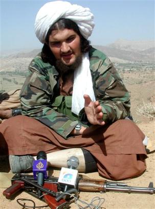 Abdullah Mehsud, a former Guantanamo Bay prisoner talks to reporters near Chagmalai on Thursday, Oct. 14, 2004 in South Waziristan along Afghanistan border. [AP]