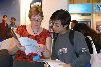 A foreigner scrutinizes a map of the Silk Road at an exhibition at the Third International Silk Road Conference Tuesday in Xi'an, the capital of Northwest China's Shaanxi Province. [newsphoto]
