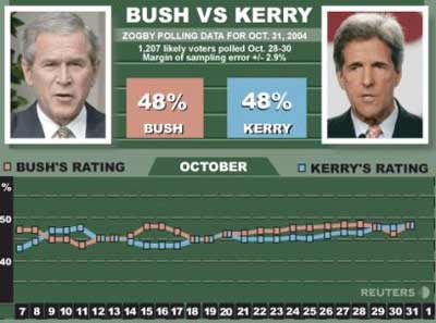 With the 2004 presidential race still a tossup, US President Bush and challenger Democrat John Kerry charged into the final two days of the contest trying to turn to their advantage an October surprise appearance by America's most hated enemy.