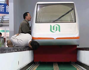 A sample train, on show at the Sixth Shanghai International Industry Fair, attracted many professional visitors Thursday. The train's technology is different from models used in Germany and Japan.The MAS train is powered by a combination of attraction and repulsion generated from permanent magnets both on the train and the tracks. Building an MAS system, he said, would cost about 30 million yuan (US$3.6 million) per kilometre, about one-10th what the German technology would cost. It would also save considerable amounts of land and energy. "I am sure of the future success of this revolutionary technology, though there are many other non-technological obstacles," said Wei, driving visitors back and forth on his model. Compared with the luxury maglev train running in Pudong from Longyang Station to Pudong International Airport, the train Wei has built with the help of two workers in five months looked shabby. It was poorly decorated and the control board was very simple. The sample, 3.75 metres long and 1.4 metres wide, sits six people inside a silver and white train car. When the train, powered by three batteries used for ordinary electric bikes, moves on the 11-metre-long tracks, it emits an uneasy noise. "The tracks had to be cut into halves before being moved from the school here and the connection is not so smooth," Wei explained. Said by Wei to "shame all other maglev experts in the world if successful," the technology was authenticated by the Shanghai Municipal Education Commission in late October. "It is improper to point out all the shortcomings of his work, but science is a serious thing and the development of a new technology usually takes a long time and a lot of tests," said Wu Xiangming, chief engineer of the Pudong maglev. Though Wei hopes his technology will be commercialized soon, there have only been inquiries to date, with no specific investments in sight. |