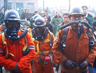 Rescuers are ready for an underground operation to search for the survivors at the iron mine November 21, 2004. [newsphoto]