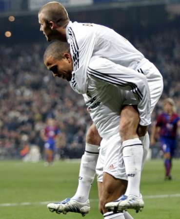 Real Madrid's Brazilian scorer Ronaldo (R) celebrates his second goal against Levante with his British team mate David Beckham during their First Division soccer match at Madrid's Santiago Bernabeu stadium November 28, 2004. [Reuters]