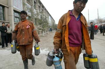 Rescue workers carry bottles of oxygen at Chenjiashan Coal Mine. The rescue work started immediately after the gas blast. [newsphoto]