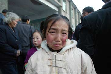 A girl could not hold back her tears as she stands outside the tunnel entrance at Chenjiashan Coal Mine in Tongchuan of Shaanxi Province. Altogether 166 miners died in the recent accident. [newsphoto/file]