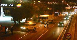 Police examine a garbage container, seen on left of photo, where a small device exploded by a gas station on the outskirts of Madrid Friday Dec. 3, 2004. [AP]