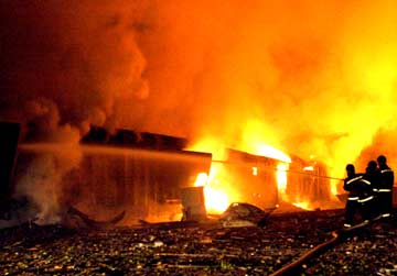 Firefighters spray water to put out a fire caused by an explosion of firecrackers in Changsha, provincial capital of Central China's Hunan Province, December 9, 2004. A railway carriage with firecrackers exploded at the suburbs of Changsha and injured 18 workers who were repairing the rails at the site. Two of them were in serious condition and rushed to a local hospital. The fire was brought under control by firefighters. [newsphoto]