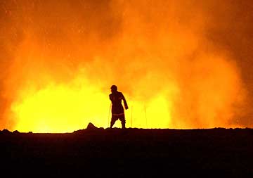 A firefighter tries to put out a fire caused by an explosion of firecrackers in Changsha, provincial capital of Central China's Hunan Province, December 9, 2004. A railway carriage with firecrackers exploded at the suburbs of Changsha and injured 18 workers who were repairing the rails at the site. Two of them were in serious condition and rushed to a local hospital.  The fire was brought under control by firefighters. [newsphoto]