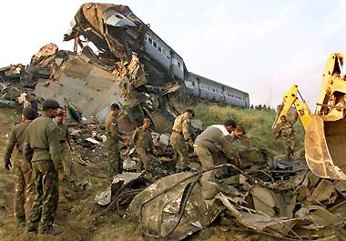 "I saw smashed bodies in the damaged coaches. There was a woman and a small child next to her. Both were dead," he said. Clothes and luggage were strewn around the site where hundreds of villagers gathered to watch the rescue. Television pictures showed several people climbing on top of the twisted carriages, apparently trying to break their way in. The express train was carrying some Hindu pilgrims home from Vaishno Devi, a revered shrine in the mountains of Jammu and Kashmir state. The Indian rail network operates nearly 14,000 trains a day, carrying more than 13 million passengers, but has about 300 accidents a year. Railway Minister Laloo Prasad Yadav told parliament he would visit the site to determine the cause of the accident. "The guilty will be punished after the reason is known," he said. The rail system is saddled with huge losses because of its rock-bottom fares and a bloated workforce, leaving little for investment in infrastructure and safety. A report on railway safety last year blamed "employee error" for 65 percent of accidents over the previous decade. A collision between two trains killed 220 people in Punjab in 1998. |