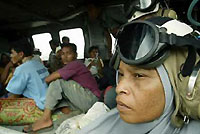 A machine the size of a large truck stood near 11 big black plastic tubes full of water. Indonesian soldiers with assault rifles stood on guard. "This is probably the most important thing. If they can get clean water, it's going to have a major impact," Australian air force Corporal Peter Clarke said. "People want to shake your hand. They say 'bless you mister'. They say 'Indonesia has problems, but you help us'." |