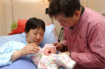 Lan Hui (L) and Zhang Tong look at their newly-born son, deemed as the 1.3 billionth citizen of China, at the Beijing Hospital of Gynaecology and Obstetrics, January 6, 2005. [newsphoto]