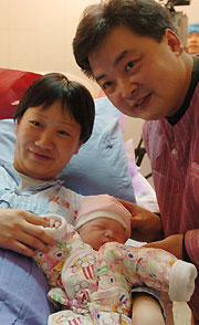 The baby poses for photograph with parents. [Xinhua]