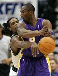 Minnesota Timberwolves guard Latrell Sprewell, left, reaches in to knock the ball away from Los Angeles Lakers guard Kobe Bryant during the first quarter in Minneapolis Monday, Jan. 10, 2005. [AP]
