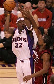 All five Suns starters hit double figures — in the first half — and Phoenix improved its NBA-best record to 31-4, the sixth-best start for a team with four losses in league history. Four of the five ahead of them went on to win the NBA title. Shawn Marion added 26 points and 11 rebounds, Steve Nash 16 points and 16 assists and Joe Johnson 24 points and nine rebounds for the Suns, who topped 120 points for the second game in a row and seventh time this season. Shaquille O'Neal had 34 points and 11 rebounds, but the Heat — beaten at Seattle on Sunday — lost two in a row for only the second time this season. The first was early November, the fifth and sixth games of the season. Dwyane Wade added 23 points for Miami. Phoenix shot out to a 17-point lead in the first quarter, and Miami never was closer than 10 again. The Heat cut the lead to 63-53 on Eddie Jones' 3-pointer with 2:06 left in the half. Stoudemire responded with a 14-foot jumper over O'Neal, then Richardson's breakaway stuff after a Miami turnover made it 67-53 with 1:21 to go. Wade lost control on a baseline drive, but the ball went in with 19.9 seconds to play in the half to cut the lead to 67-55. The Heat were down 71-61 on Wade's basket early in the second half, but the Suns went on one of their trademark runs, this one 18-4, to go up 89-65 on Stoudemire's soaring dunk with 6:40 left in the third. In the fourth quarter, Stoudemire was knocked down by O'Neal, but flipped the ball in sidearmed as he fell. He made the free throw for a three-point play to put Phoenix up 105-85 with 9:46 left. O'Neal's basket cut it to 106-89, but Marion responded with a baseline jumper, then Johnson made his fourth 3-pointer of the game, and third of the half, and it was 111-91 with 7:24 remaining. Despite Miami's attempts to slow the tempo, the Suns raced to their highest-scoring first quarter of the season, taking a 40-25 lead. Stoudemire made all four of his first-quarter shots — each one from beyond 15 feet. O'Neal scored 17 in the first half on 8-for-9 shooting, five of them dunks. The game's pattern was the same, but less one-sided, than Phoenix's 124-89 rout of Indiana on Sunday. In that game, the Suns led by 22 in the first quarter. The Heat and Suns are a combined 30 games ahead of their pace from last season. ... Phoenix began a stretch of four games in five nights, the next three on the road. ... The Suns had their sixth sellout of the season. ... O'Neal and Stoudemire are 1-2 in the NBA in dunks. ... Suns chairman and CEO Jerry Colangelo, who underwent prostate cancer surgery on Dec. 30, attended the game and got a big cheer when shown on the arena's big screen.
