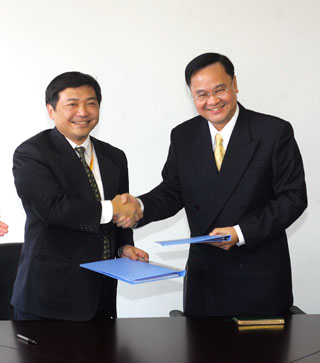 Hu Zhenming (L), general manager of flight planning and international business of China Eastern Airlines, shakes hands with Tung Wei, a deputy director of ground service department of Taiwan-based China Airlines in Shanghai January 19, 2005 after signing a ground service agreement of direct across-Straits flights.