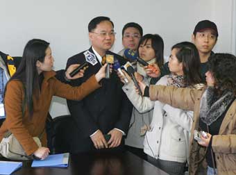 Tung Wei, a deputy director of ground service department of Taiwan-based China Airlines in Shanghai, answers questions from journalists in Shanghai January 19, 2005 after signing a ground service agreement of direct across-Straits flights. [newsphoto]