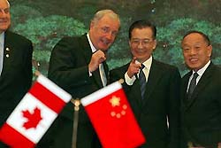 Premier Wen Jiabao (second right) and visiting Canadian Prime Minister Paul Martin (third right) talk during a signing ceremony at the Great Hall of the People yesterday. The two sides signed a joint statement to improve co-operation in international affairs, and a dozen other agreements and memoranda of understanding.