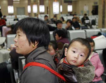 A mother and her son wait for hometown-bound buses at a Shanghai long-distance bus terminal, said to be the largest and most modern one in Asia January 25, 2005. [newsphoto]