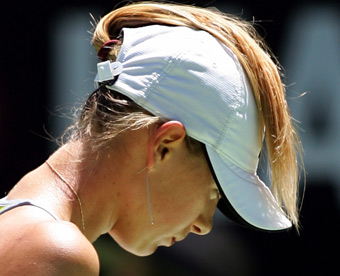 Fourth seed Russia's Maria Sharapova pulls her hair over her hat during her quarter-final match against fifth seed compatriot Svetlana Kuznetsova at the Australian Open tennis tournament in Melbourne January 25, 2005. Sharapova won the match 4-6 6-2 6-2. [Reuters]