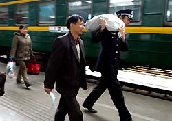 A police helps a migrant worker with the luggage on January 25, 2005. Migrant workers have propelled the provincial population to top place of China. [newsphoto]
