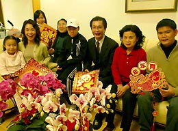 C.L. Yan (3rd right), vice-president of the Beijing Association for Taiwanese-funded Enterprises, and his wife (2nd left) greet family who arrived in Beijing by a direct cross-Straits charter flight. The family will spend their Spring Festival in Beijing. [newsphoto]