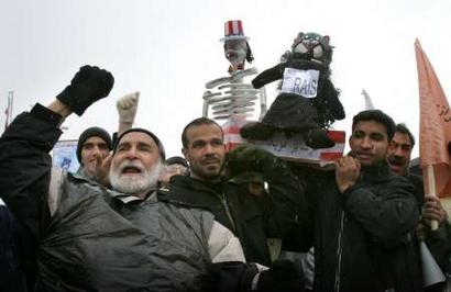 NEED TALKS TO CONTINUE One European diplomat in Tehran said it was typical for Iran to turn up the heat of its rhetoric in the run-up to a round of talks with the EU and then soften its stance afterwards. "It's typical posturing. At the end of the day they don't want to go to the Security Council so they need to continue the EU talks," the diplomat said. Those at Thursday's annual demonstration said Iran would not back down in the face of U.S. threats. "The U.S. is after an excuse. If we stop atomic technology, they will find another excuse," said Habibollah Hosseini, a 68-year-old cleric. "They invaded Iraq although there were no weapons (of mass destruction). The best response to intimidation is unity and power. We are here to show this," he said. Several carried effigies of Bush, one of which, carrying a banner which read "I love war" was burned. |