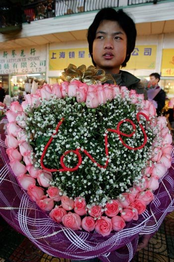 ![]() A Chinese man carries a heart-shaped bouquet