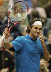 Federer showed deft play at the net and strong passing shots, serving three love games in a row.