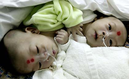 The conjoined twins lie in a hospital in Shanghai March 1, 2005. [newsphoto]