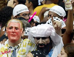 Revelers dressed as George W. Bush (L) and Osama bin Laden join thousands dancing on Rio Branco Avenue in Rio de Janeiro, during a party organized by the Bola Preta Carnival club, February 5, 2005. [Reuters]
