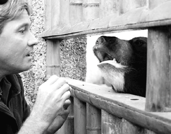 Steve Irwin gets up close to Rupert who is living out his days in the "Spoilt Bear" enclosure. A large handsome creature, Rupert is so psychologically traumatized each time he was released into the rehabilitation enclosure he kept walking into the electrified perimeter fence. [photo courtesy of AAF]