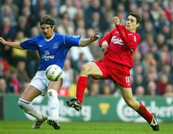 Everton's Alessandro Pistone, left, closes in on Liverpool's Antonio Nunez during their English Premiership soccer match played at Anfield, Liverpool, England, Sunday March 20, 2005. [AP]