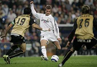 England Real Madrid player David Beckham, center, prepares a shot as he duels with Malaga players Fernando Sanz from Spain, left, and Alexis from Spain, right, during their Spanish league soccer match in Madrid, Sunday, March 20, 2005. [AP]