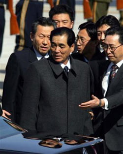 North Korean Premier Pak Pong Ju, center, is escorted to a car on his arrival at Beijing airport Tuesday March 22, 2005. [AP]