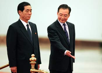 Chinese Premier Wen Jiabao (R) directs North Korean counterpart Pak Pong-ju during a welcome ceremony at the Great Hall of the People in Beijing March 22, 2005. Premier Pak Pong-ju began a visit to China on Tuesday. [Reuters]